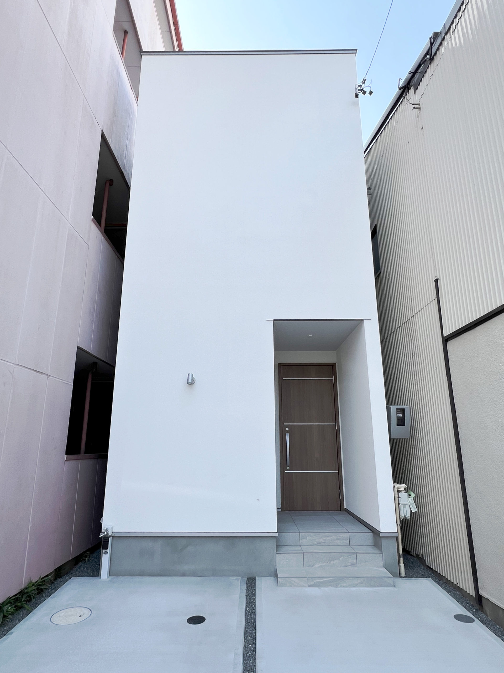 シンプルな白く四角い外観の新築RC住宅。
